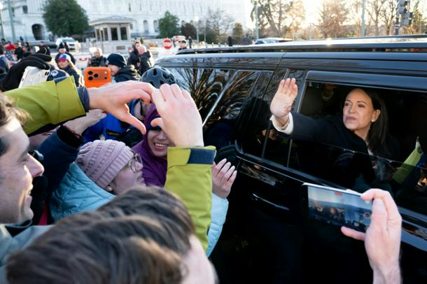 Venezuelan opposition leader Maria Corina Machado waves to supporters from her car as she departs the US Capitol after meeting with US senators on January 15, 2026