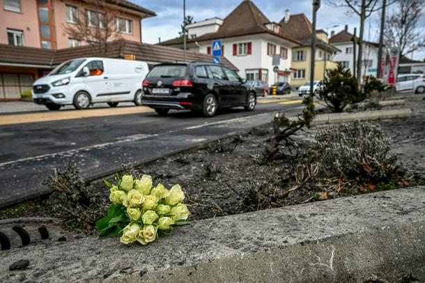 Flowers at the site where a bus caught fire in western Switzerland on March 10, 2026