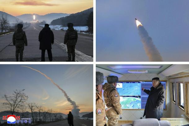 (COMBO) This combination of pictures taken on January 4, 2026 and released by North Korea's official Korean Central News Agency (KCNA) via KNS on January 5, 2026 shows North Korean leader Kim Jong Un inspecting a missile launch exercise in Pyongyang