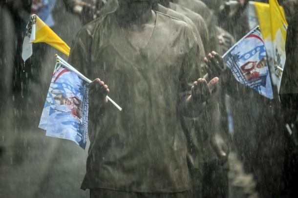 The heavens opened just seconds after the pope’s arrival, drenching the prisoners and the courtyard. At the end of the meeting, sodden inmates chanted “libertad” (freedom).