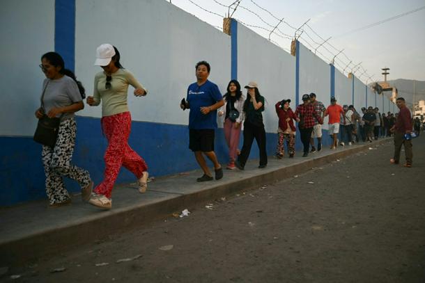 People run to cast their votes at a school polling station in Pamplona Alta, in the San Juan de Miraflores district on the outskirts of Lima