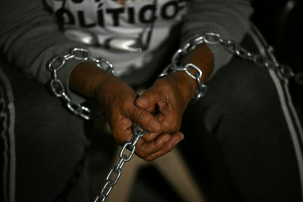 A relative of a political prisoner remains chained outside the prison in Caracas