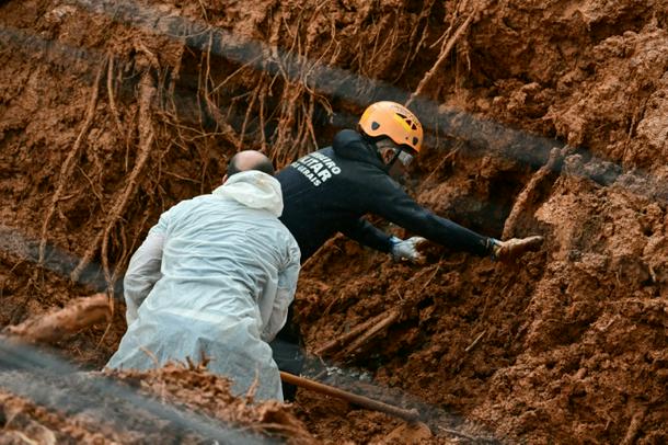 This aerial view shows rescue teams searching for victims amid the debris after a landslide caused by heavy rains in the Barrio Parque Jardim Burnier neighbourhood in Juiz de Fora, Minas Gerais State, Brazil