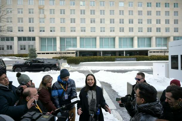 Venezuelan opposition leader Maria Corina Machado speaks to reporters after meeting with US Secretary of State Marco Rubio in Washington