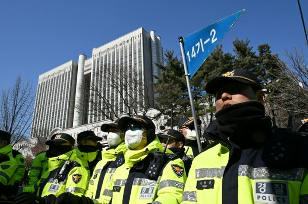 Police officers stand guard at the entrance to the Seoul Central District Court on Thursday.