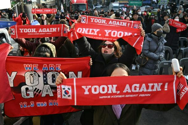 Supporters of South Korea's impeached former president Yoon Suk Yeol react as they watch a livestream of Yoon's trial in front of the Seoul Central District Court in Seoul on January 16, 2026