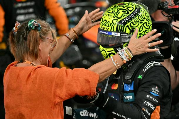 Lando Norris (R) gets a hug from his Belgian mother Cisco after winning the world championship in Abu Dhabi