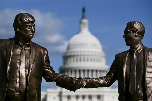 A statue depicting US President Donald Trump and Jeffrey Epstein holding hands is seen near the US Capitol on October 2, 2025