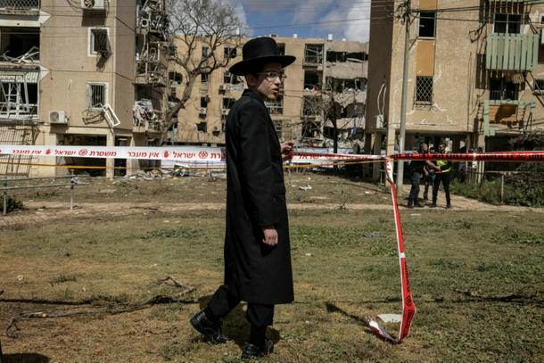 An Israeli Orthodox Jew inspects the site of an Iranian missile strike in Arad on March 22