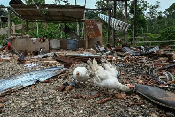 Geese walk amidst the rubble after a bomb was dropped by the Ecuadoran army near the Colombian border