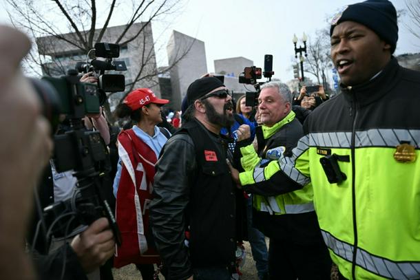 Law enforcement separate counter protestors as they clash with participants as they march to the US Capitol