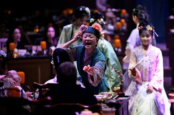 Diners were ushered into a grand, circular room, served by waiters dressed in "hanfu", and treated to an eight-act performance involving twirling dancers and emotive dialogue from actors