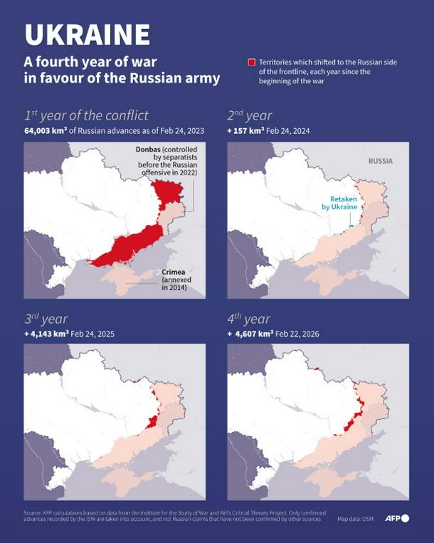 The Russian army seized more territory during the fourth year of the Ukraine war than in the preceding two years combined, according to an AFP analysis of data from the Institute for the Study of War (ISW).
