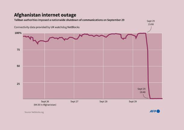 Infographic chart of data from UK monitoring group NetBlocks showing the drop of internet connectivity in Afghanistan after Taliban authorities imposed a nationwide shutdown on September 29.