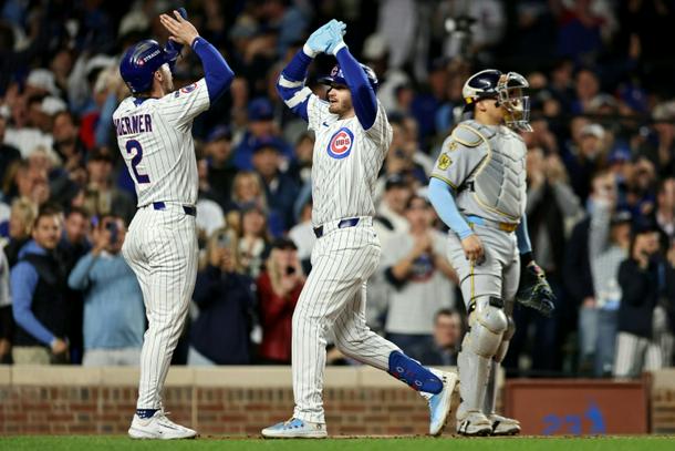 Nico Hoerner and Ian Happ of the Chicago Cubs celebrate Happ's first-inning home run in an MLB playoff win over the Milwaukee Brewers