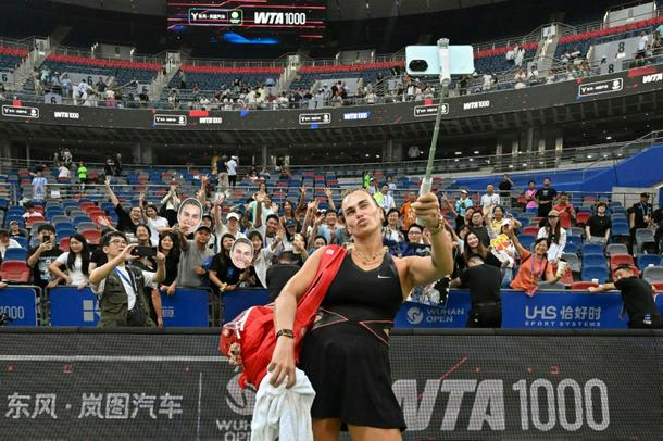 Aryna Sabalenka takes a selfie after beating Liudmila Samsonova in Wuhan