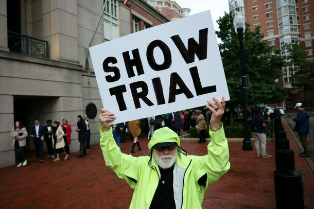 Bill Christeson holds up a sign that reads "Show Trial" outside the Virginia court where former FBI director James Comey is to be arraigned