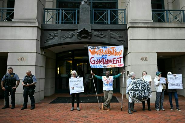 Demonstrators protest outside of the Albert V. Bryan United States Courthouse ahead of the arraignment of former FBI director James Comey