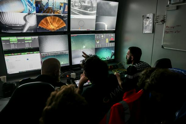 Experts monitor the underwater robot's slow descent on screens